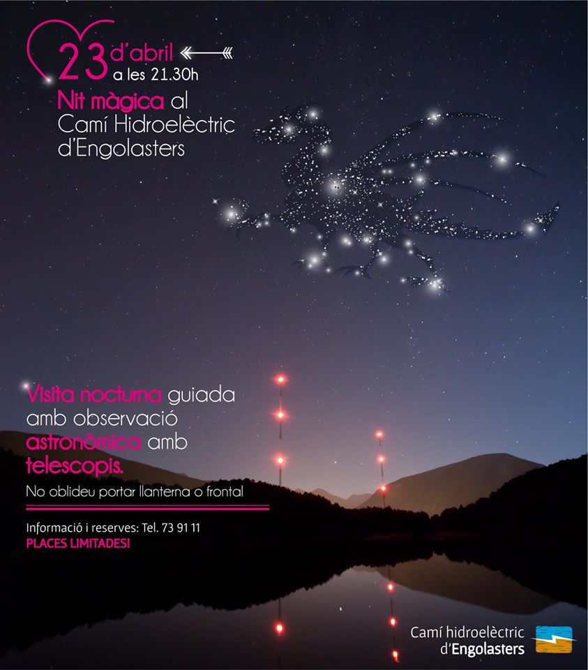 FEDA organitza, coincidint amb la diada de Sant Jordi, una visita nocturna al Camí hidroelèctric d’Engolasters. En aquesta ocasió, serà amb tot un al·licient: una observació astronòmica. Per aquesta finalitat, experts del Parc astronòmic del Montsec vinguts expressament a Andorra, instal·laran telescopis a Engolasters per visualitzar els astres, planetes i constel·lacions que les condicions meteorològiques permetin observar. Així mateix, faran explicacions divulgatives sobre el cel i l’univers.
