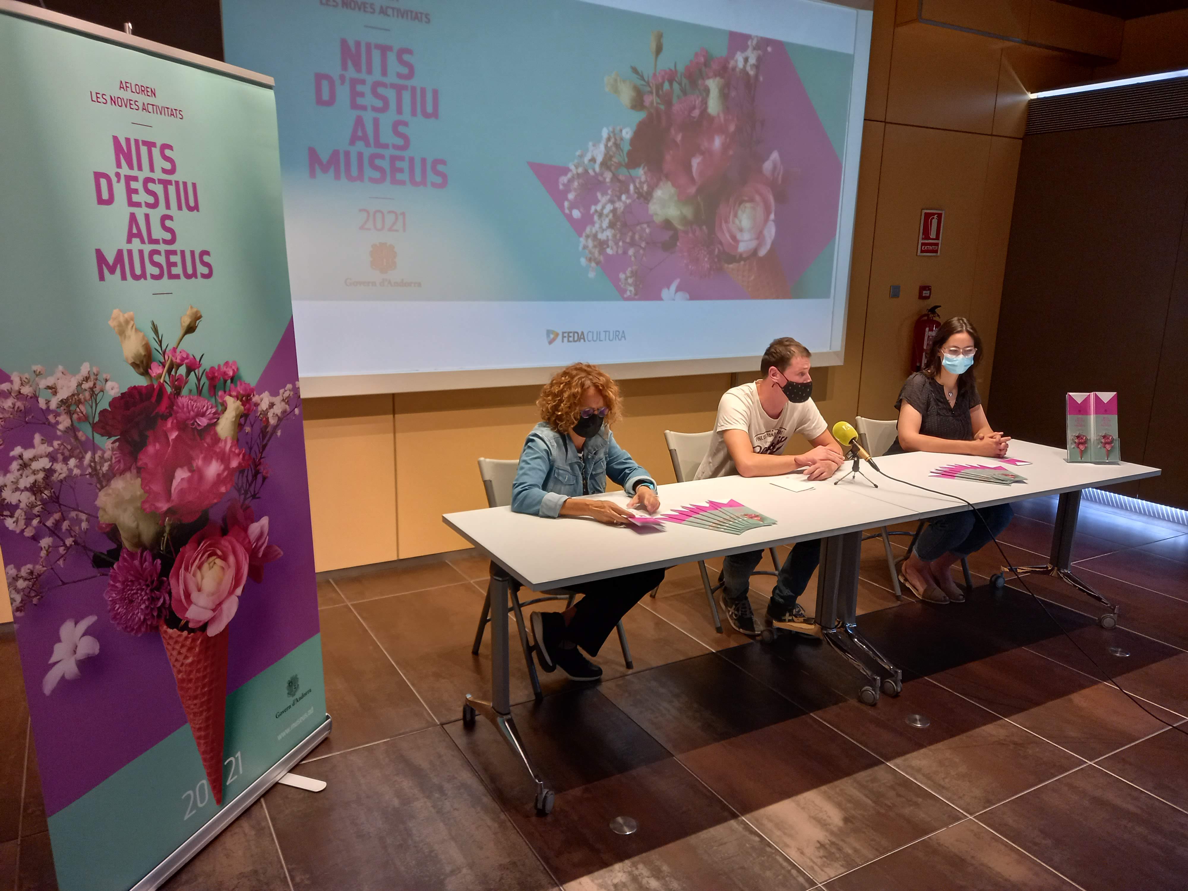Teresa Areny (Museu Carmen Thyssen Andorra i Fundació ONCA), Eduard Tarrés (Ministeri de Cultura) i Katia Vilana (FEDA CUltura) a la presentació de les Nits d'estiu als museus