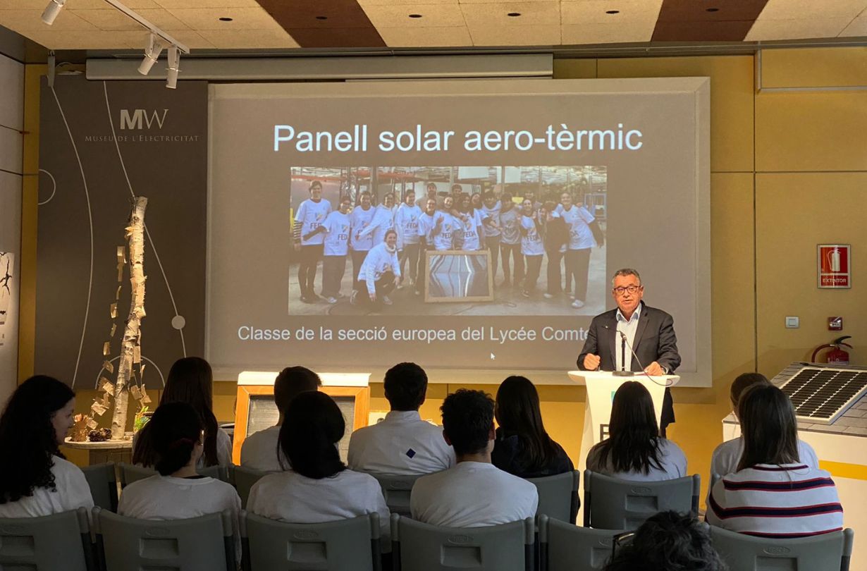 Un grup d’alumnes de Première Section Européenne del Lycée Comte de Foix ha construït un sistema basat en l’aprofitament de les energies renovables per a la calefacció de les llars el qual ha presentat aquest dimecres al MW Museu de l’Electricitat. Aquest panell solar aerotèrmic és el primer fruit del conveni de patrocini de FEDA per a la realització d’aquests projectes educatius que es va anunciar al març i que té per objectiu aprofundir en la divulgació de la transició energètica i les solucions sostenibles, pilars de l’organització.