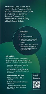 Amb l’objectiu d’impulsar la presència femenina en aquest àmbit, FEDA ofereix una beca per a dones que cursin Formació Professional en especialitat elèctrica (MELEC) al Lycée Comte de Foix. Aquesta iniciativa busca fomentar la igualtat d’oportunitats i potenciar el talent femení en el sector elèctric.